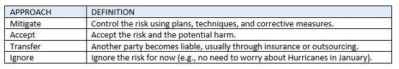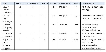 Un registre des risques est une vue tabulaire des risques. Outre la probabilité, le préjudice et le score calculé, les registres de risque incluent normalement les tendances, les approches, les commentaires et la priorisation. La norme pour les tendances est Amélioration, Aggravation, Pas de changement et Nouveau, qui peuvent être représentés respectivement par les symboles ↑, ↓, ↔ et le mot Nouveau. La norme pour les approches est Mitigate, Accepter, Transférer et Ignorer, définie dans le tableau ci-dessous :