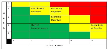 Un tableau de bord des risques, également appelé carte thermique, place les risques sur un diagramme avec la probabilité sur un axe et les dommages sur l'autre. Nous sommes tous habitués à la signification du vert, du jaune et du rouge. Un risque ayant une note de 3 pour la probabilité et le préjudice serait affiché dans la cellule centrale du graphique. Une image consolidée du risque organisationnel peut être communiquée une fois que tous les risques sont placés dans les cellules appropriées. Un exemple de registre des risques et de carte d'évaluation des risques (avec des informations provenant de l'exemple de registre des risques) est présenté ci-dessous :